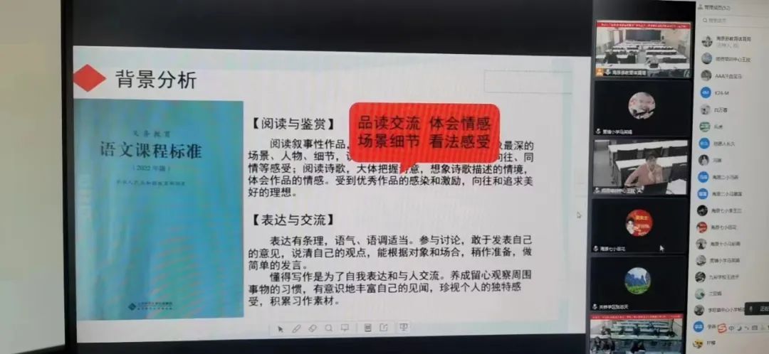 经个人申请,语文学科组推荐,由田彦萍老师承担本次授课主讲人。备课组的老师们群策群力,积极研讨。参会人员集思广益,经过反复研讨推敲,一节精彩纷呈、充满语文味儿的“云”上示范课,给与会的每一位老师提供了大单元教学设计的思路与方向。