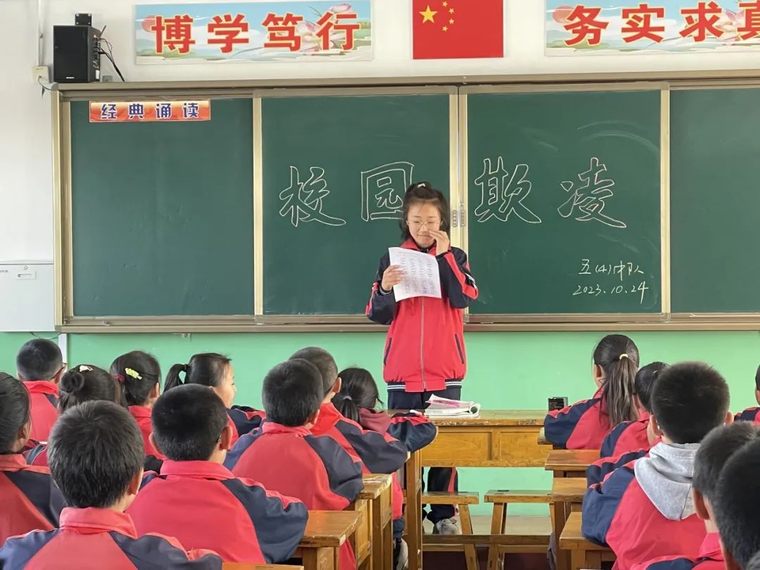 各中队结合主题班队会活动,向学生宣传校园欺凌行为的危害性。让学生明白什么是校园欺凌,如何预防校园欺凌,以及面对“欺凌”该如何应对,使学生们懂得了在面对校园欺凌时,如何正确、有效地保护自己和同学。