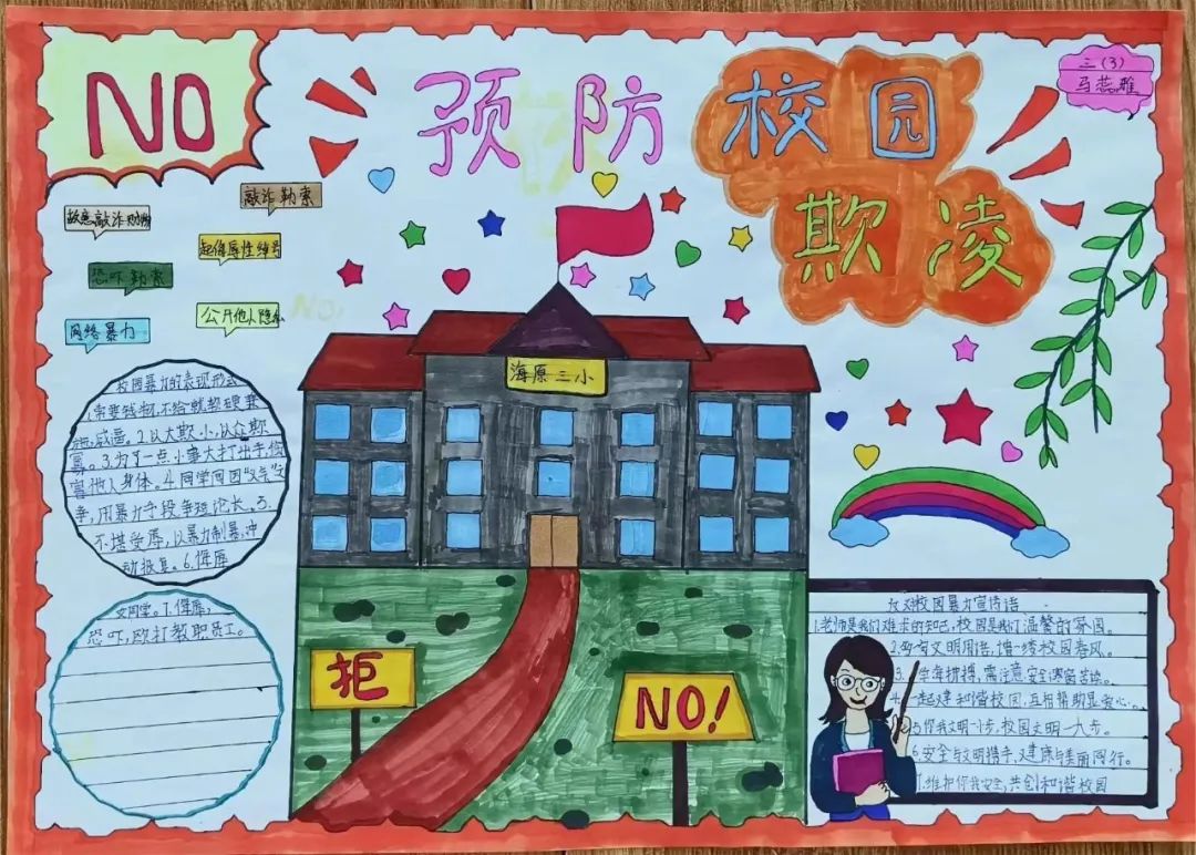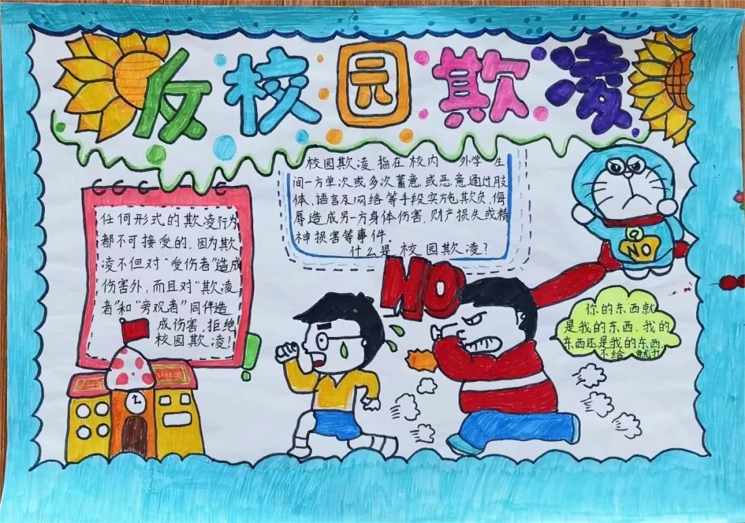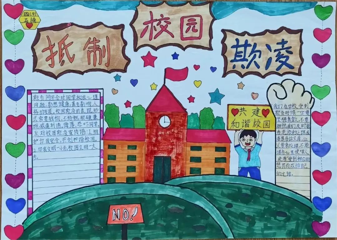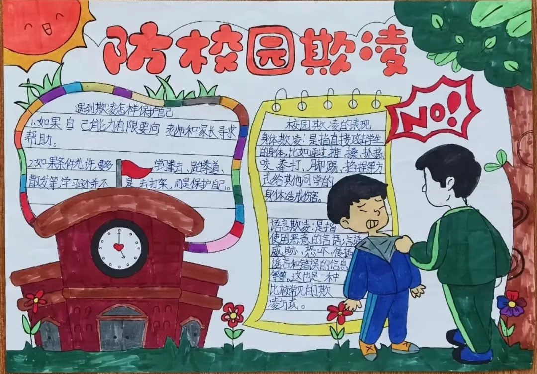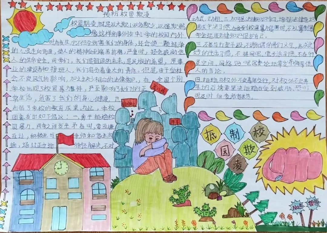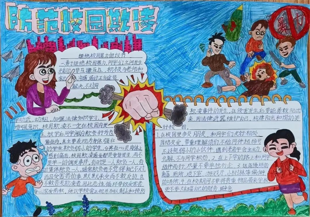 以班级为单位,学生们自主创作以反对校园欺凌为主题的手抄报,在参与过程中更加深入地体会校园欺凌的危害,在日常点滴中渗透反对欺凌的思想。