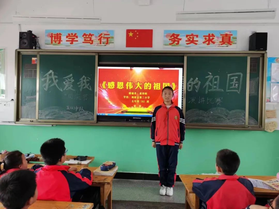 小小少年心,悠悠爱国情。在伟大的祖国第74个华诞来临之际,海原三小全体师生衷心祝愿伟大的祖国繁荣昌盛、国泰民安。同学们立志:刻苦学习知识,坚定理想信念,磨炼坚强意志,锻炼强健体魄,当时代召唤时,能挺身而出,为祖国的建设贡献自己的力量!