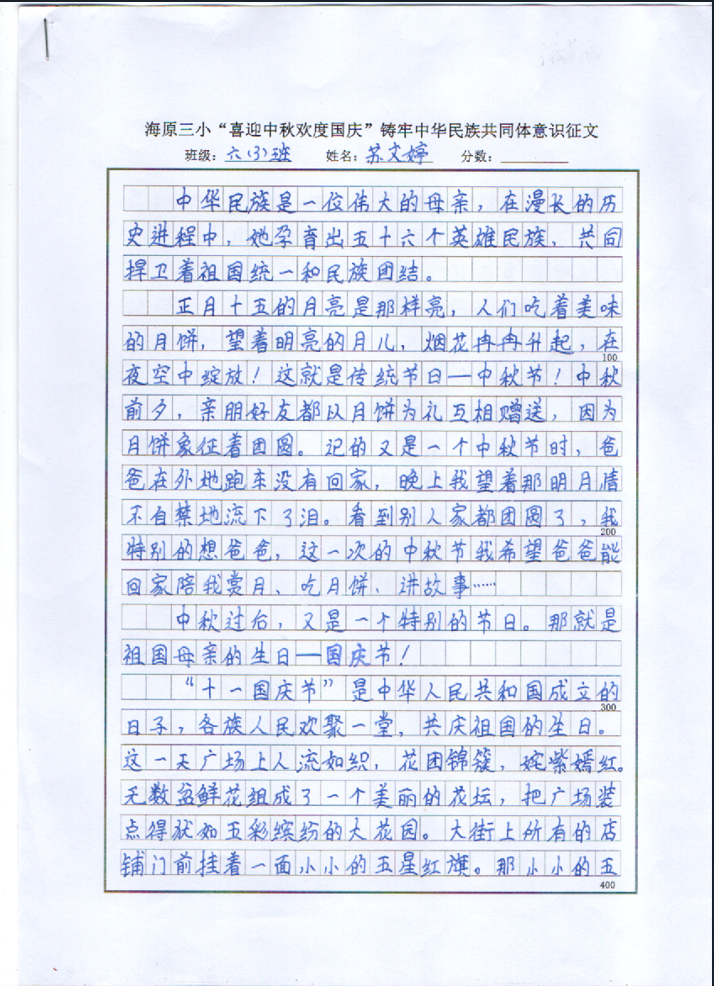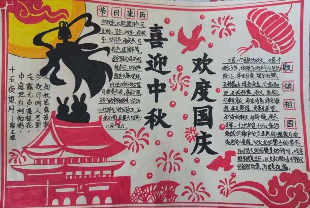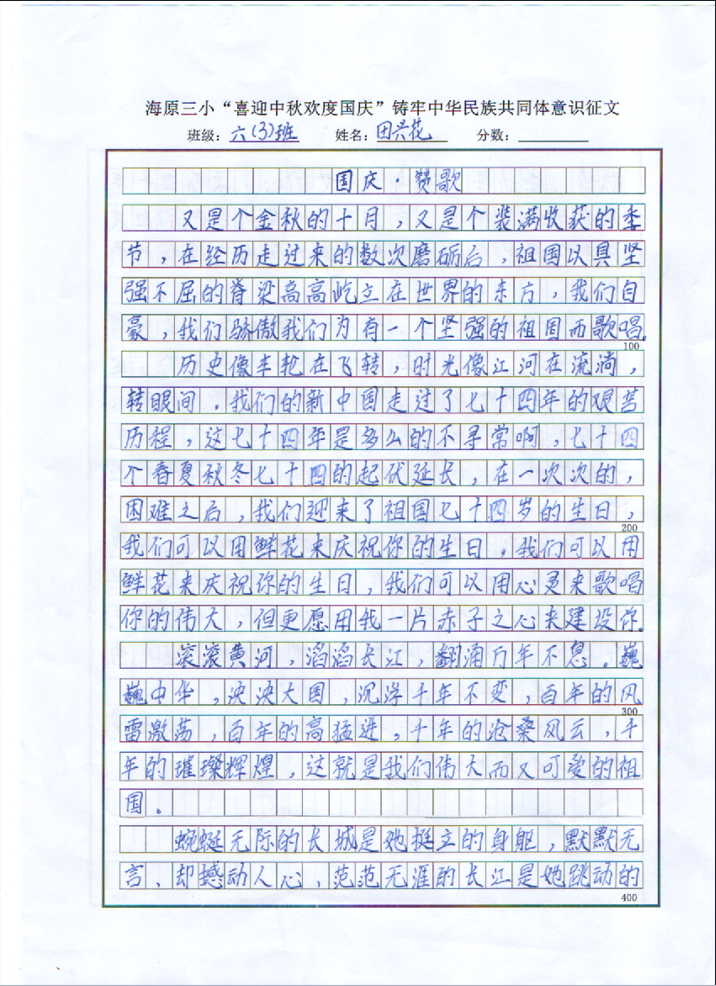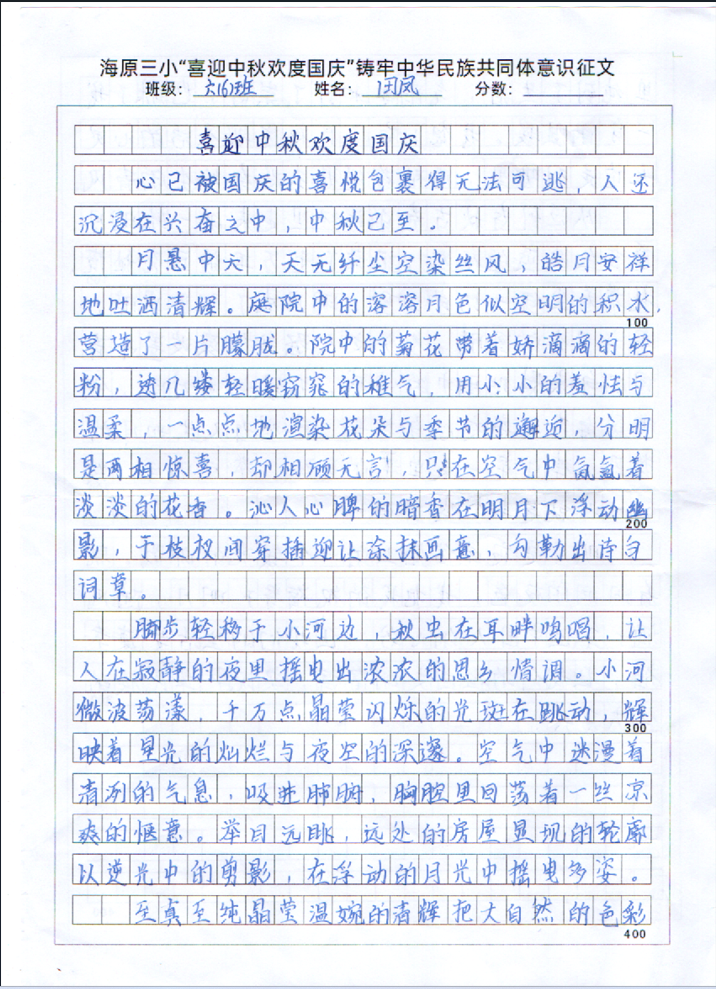 为庆祝第74个国庆节的到来,我校举办了“喜迎中秋 欢度国庆”为主题的征文比赛活动。此次比赛,同学们踊跃参与,将自己的爱国之情融入笔墨,在白纸上绽放朵朵芬芳,向我们亲爱的祖国母亲献上了他们最真挚的祝福。