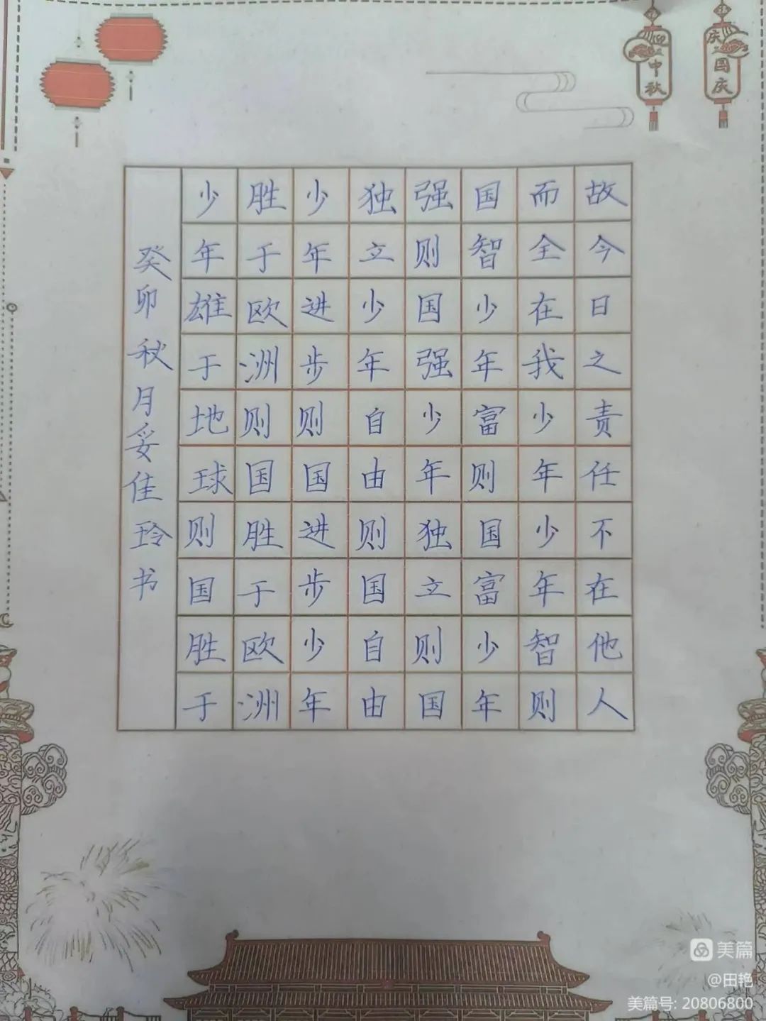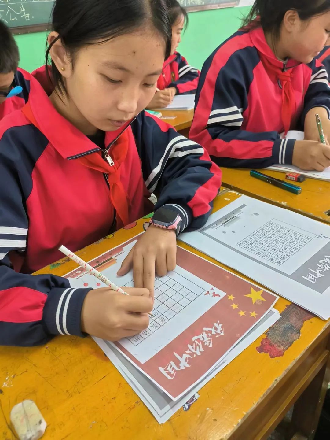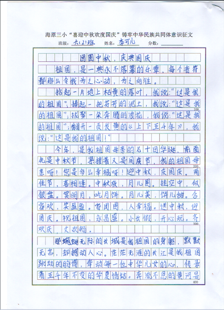 为了培养学生的动手能力,激发学生书写兴趣,营造国庆的爱国氛围。我校书法特色班级以国庆为契机,以书写为形式,以比赛为平台,表达出对祖国的热爱之情和美好祝愿。