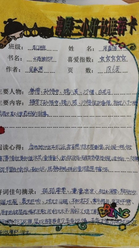 一张张图文并茂、漂亮精致的“好书推荐卡”,凸显了孩子们阅读时的投入和情感,展现了他们的个性阅读,孩子们在推荐卡上写满了推荐书目的名称、推荐理由及精彩摘抄,每一张推荐卡都承载着同学们的奇思妙想和美好愿望……