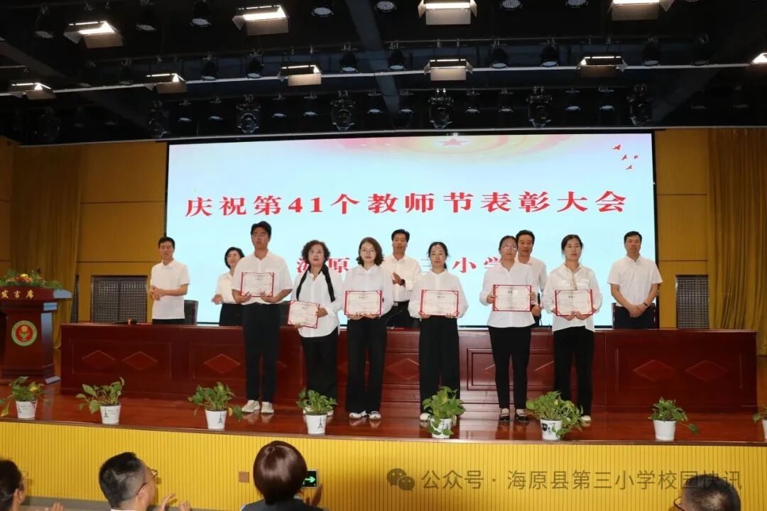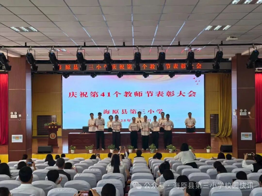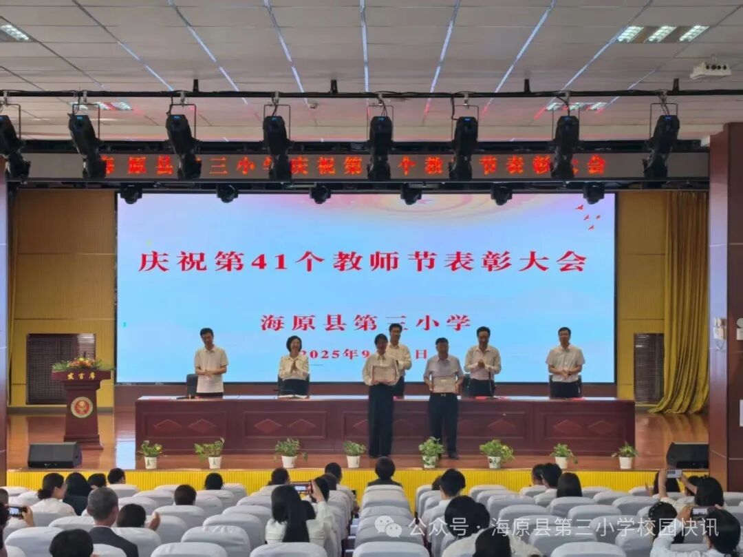 在第41个教师节来临之际,为弘扬尊师重教优良传统,激励全体教师坚守育人初心、潜心立德树人,海原三小于2025年9月10日,以一场温暖而隆重的表彰大会,向辛勤耕耘的教育工作者致以最崇高的敬意!全体师生齐聚报告厅,共同庆祝属于教育工作者的光荣节日,在晨光中谱写师者仁心的动人篇章。