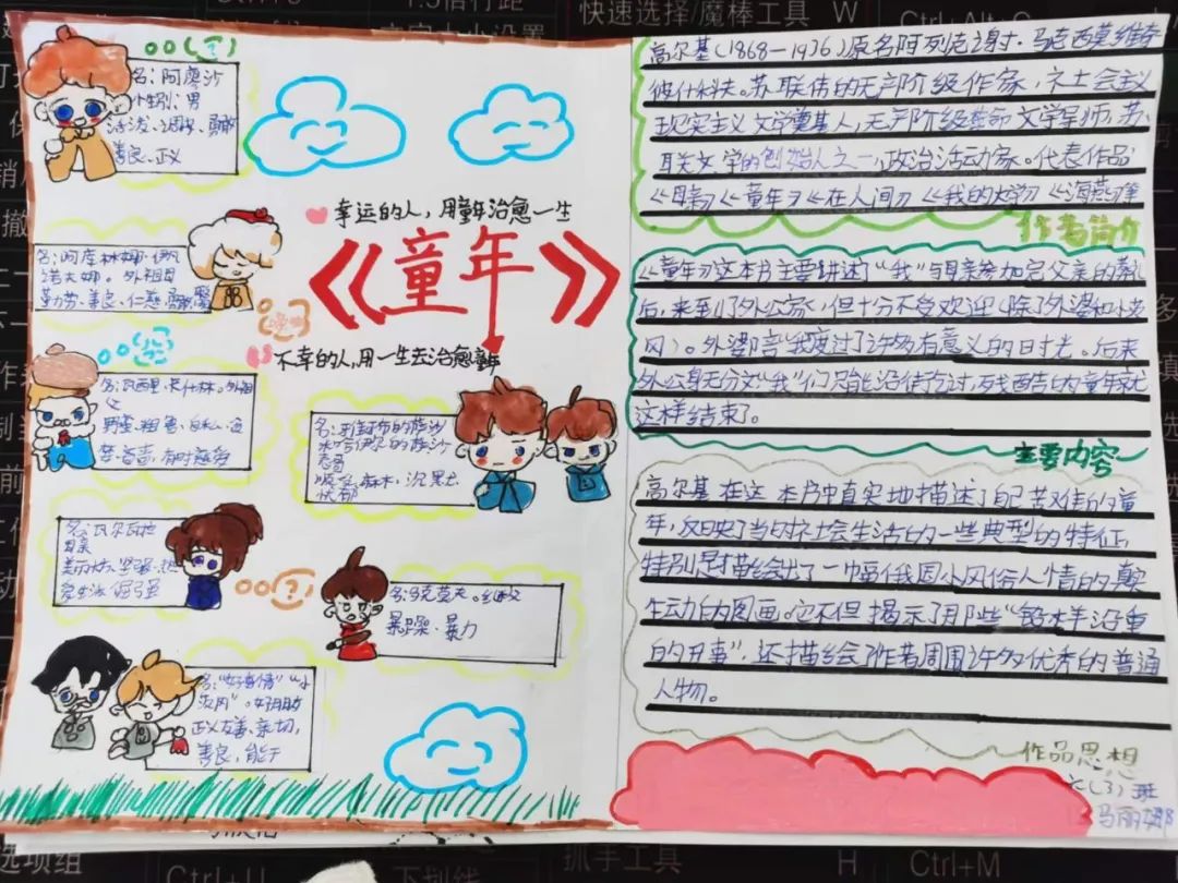 马红美老师执教的是《童年》整本书阅读交流课,课前马老师向大家展示了近段时间学生的读书收获,和学生一起回顾读整本书的历程。