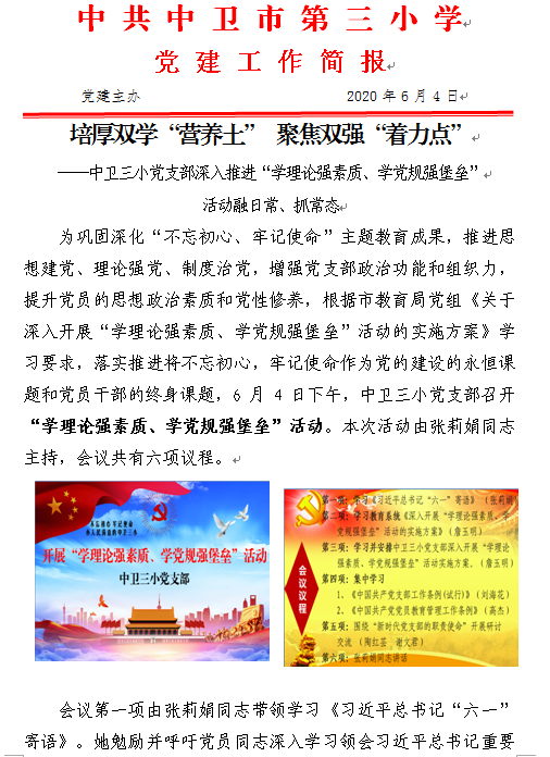 发布时间:2020-06-05 00:00 栏目:党建动态 发布单位:中卫三小党支部 点击量:3161 【公开】