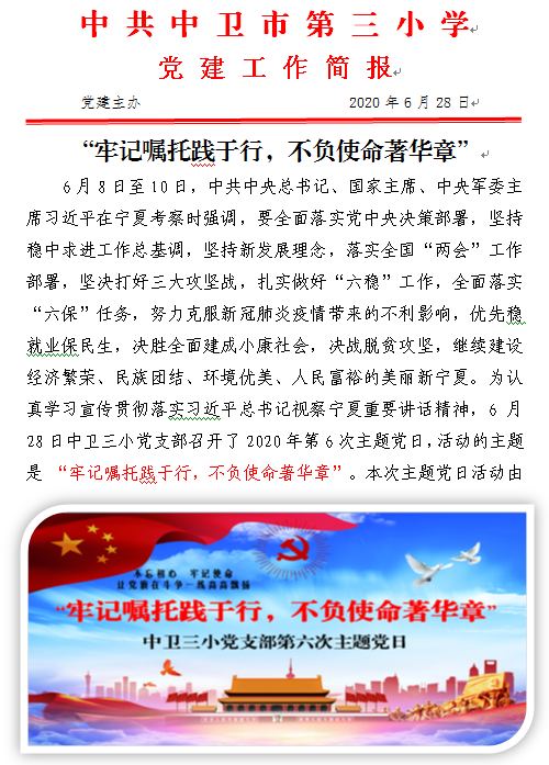 发布时间:2020-06-28 00:00 栏目:党建动态 发布单位:中卫三小党支部 点击量:3218 【公开】