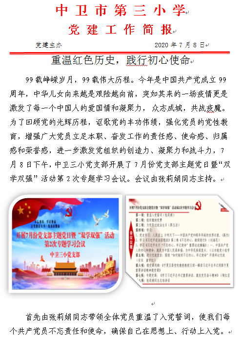 发布时间:2020-07-08 00:00 栏目:党建动态 发布单位:中卫三小党支部 点击量:4215 【公开】