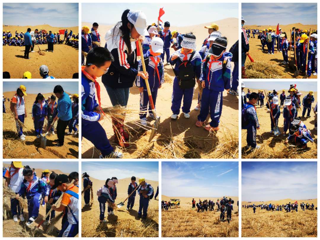 沙坡头麦草方格是享誉国内外的治沙成果。它是新中国60年代沙退人进 的伟大发明,是每个中卫人的骄傲。人们利用废弃的麦草一束束呈方格状铺在沙上,再用铁锹轧进沙中,留麦草的1/3或一半自然坚立在四周,然后将方格中心的沙子拨向四周麦草根部,使麦草牢牢地竖立在沙地上。轧制的麦草方格与两弹一星同获国家科技进步特等奖。孩子们通过亲自动手实践,探究麦草方格治沙的奥秘,增强了保护环境的意识。