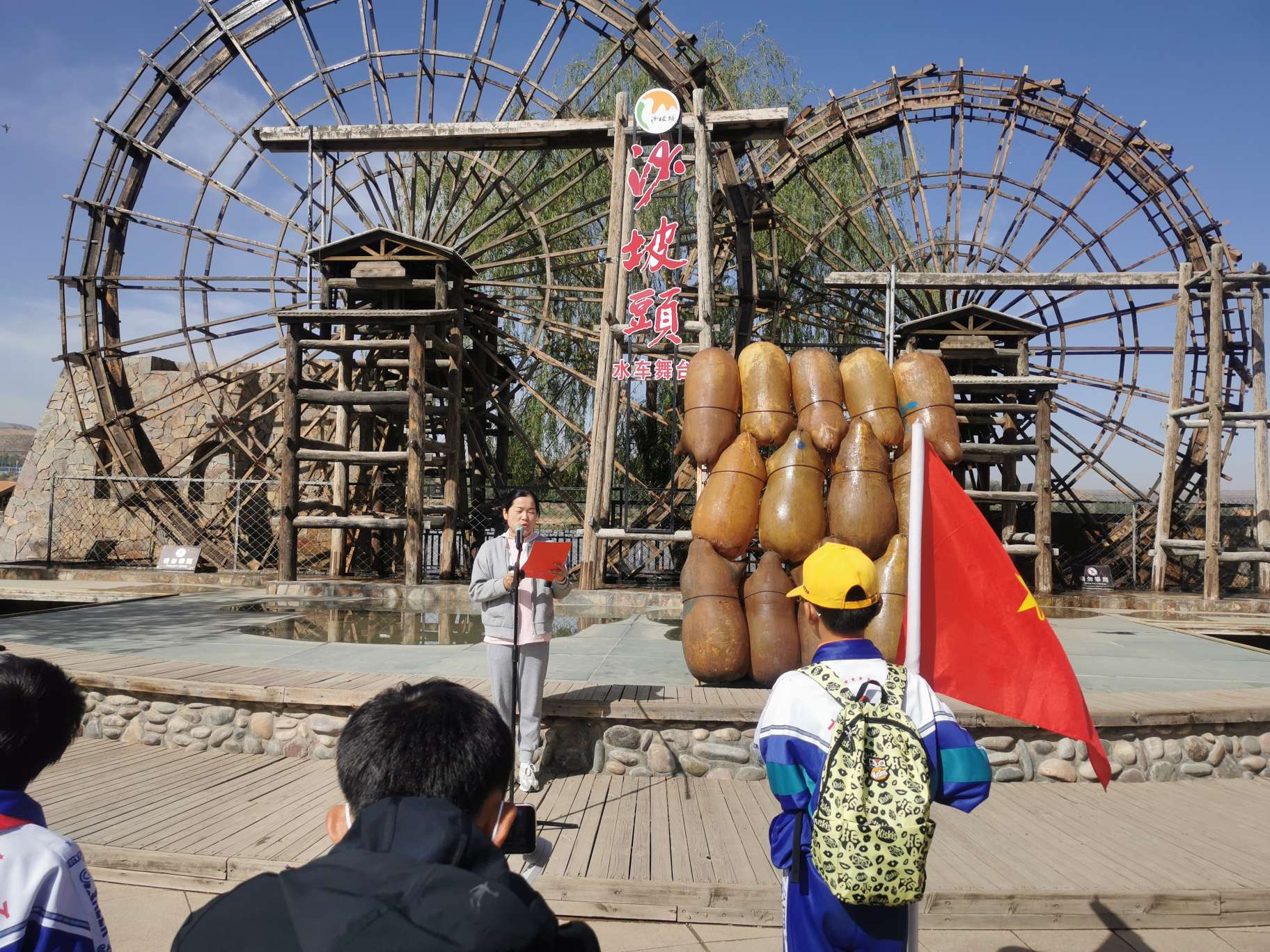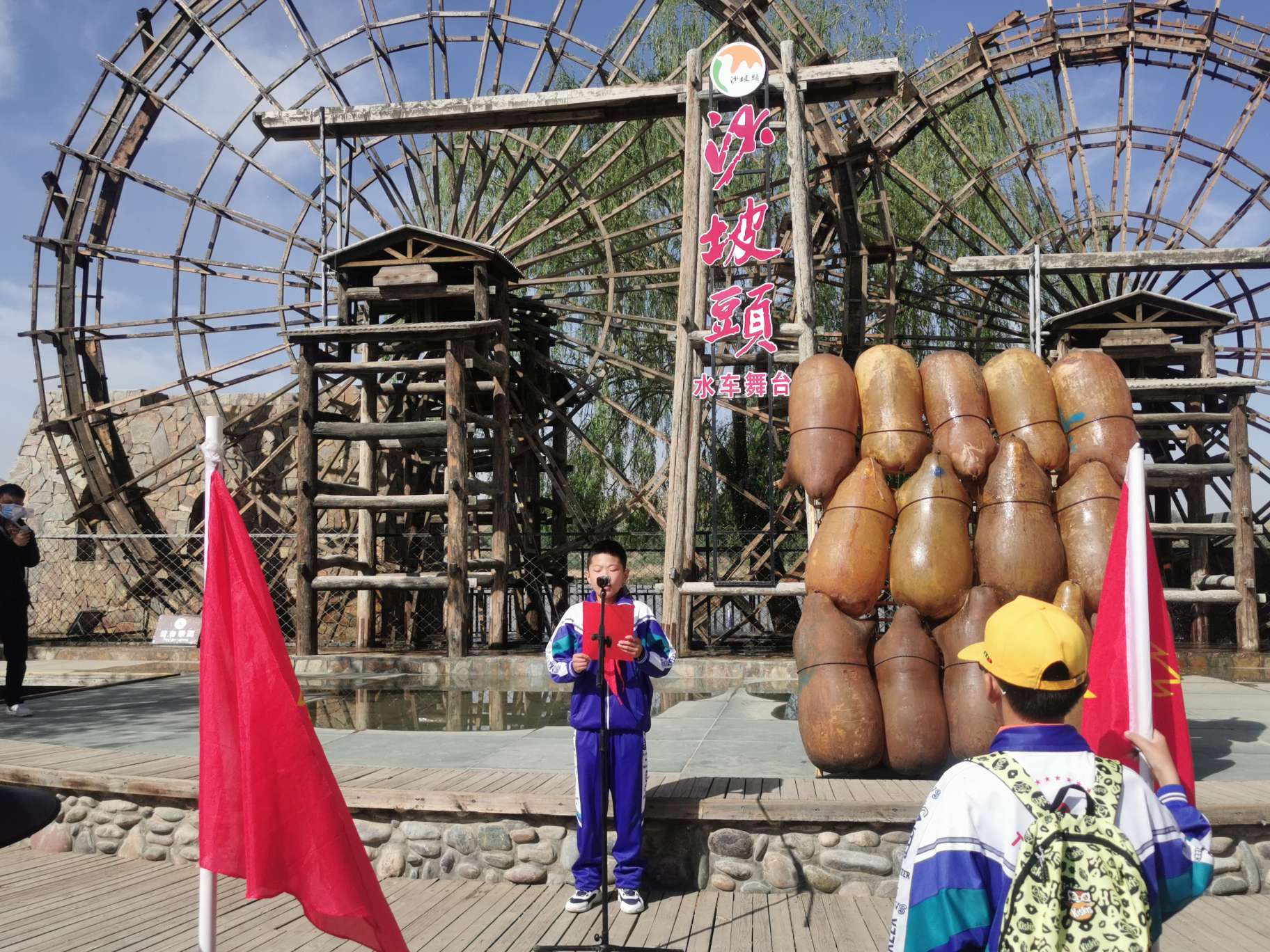 伴随着一路的欢声笑语,我们到达中卫市沙坡头旅游景区。在旅行团导游的组织下,本次研学活动的开营仪式在沙坡头水车舞台前举行。在开营仪式上郭丽芬主任代表学校激情致词。致词中,郭主任希望同学们在行程中细心观察、善于发现、积极探索,在研学中感悟人生:在旅行中同学们要严守纪律、听从指挥、服从管理,确保安全,在实践中增进友谊,树立文明礼貌、和谐友爱、爱护环境的美好形象。四年级9班李梓源同学作为学生代表在开营仪式上发言,随后郭主任宣布研学活动正式开始。