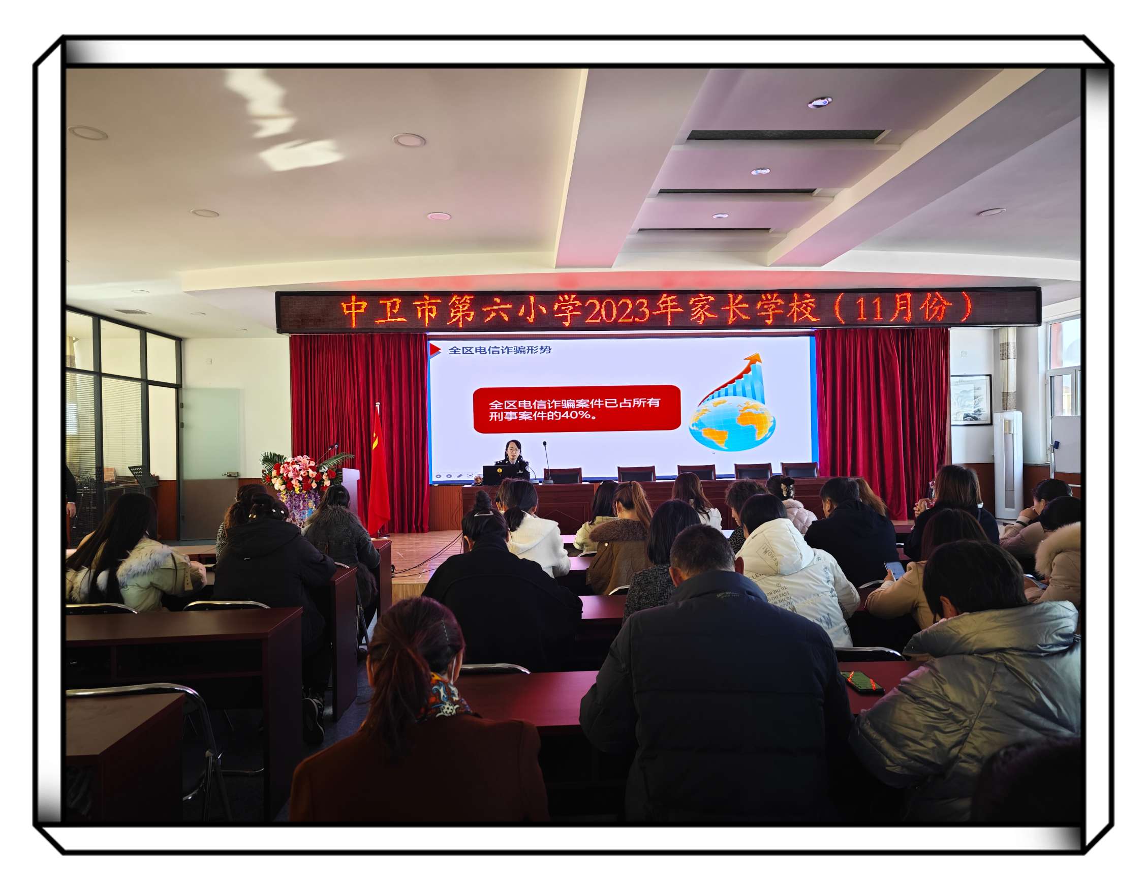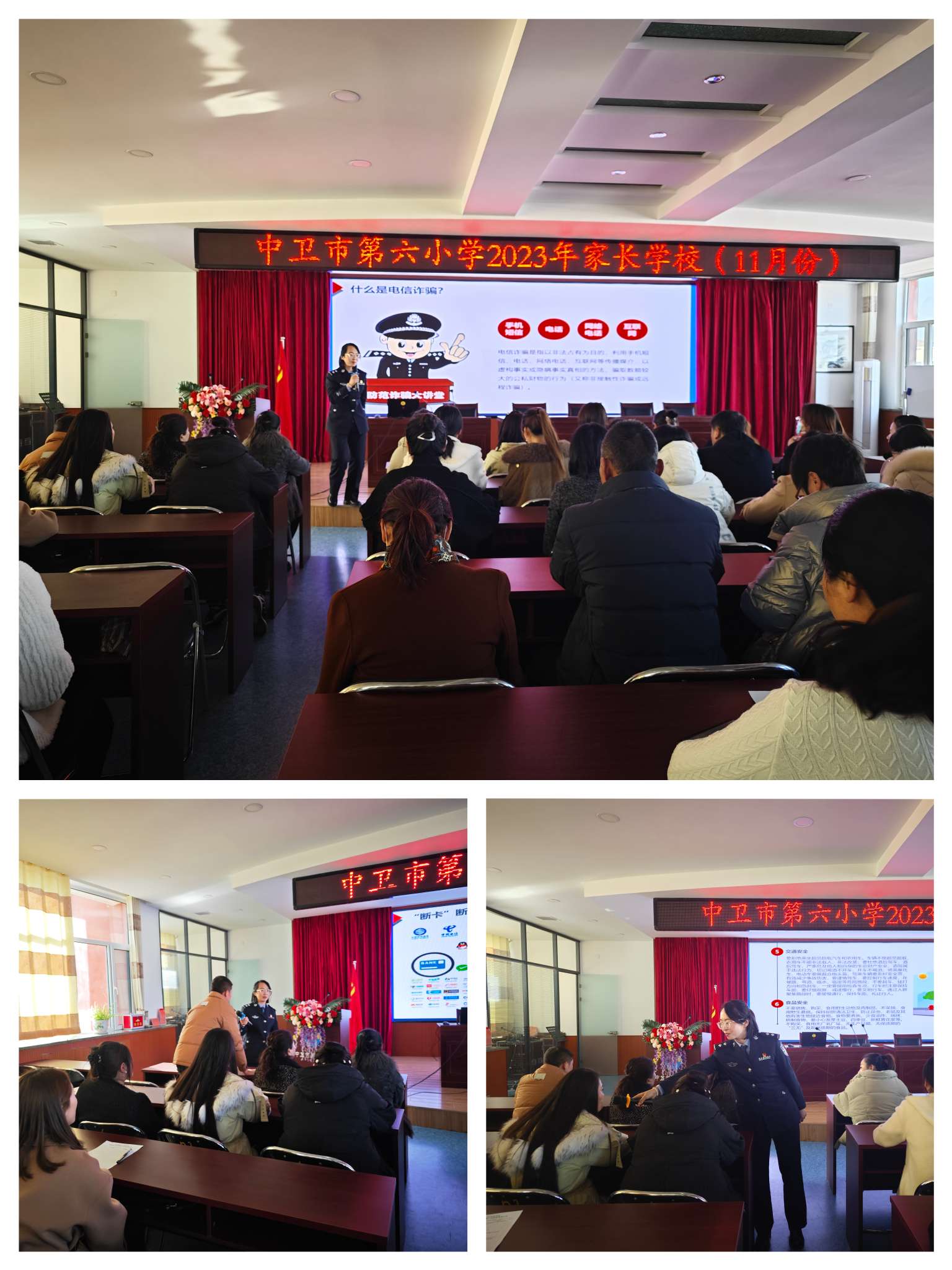 科技发展日新月异,诈骗手段层出不穷,为了进一步增强家长们的反诈意识,全力防范电信网络诈骗,切实提高家长们的防范意识和识别能力,2023年11月22日下午,中卫市第六小学特邀法治副校长——中卫市公安局文昌派出所王薇警官来学校开展防范电信诈骗安全知识宣传活动。