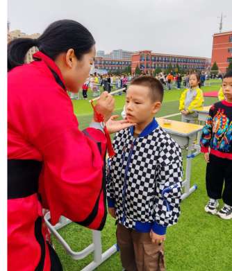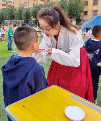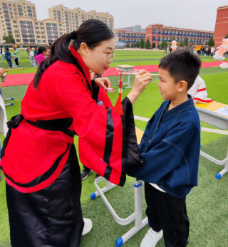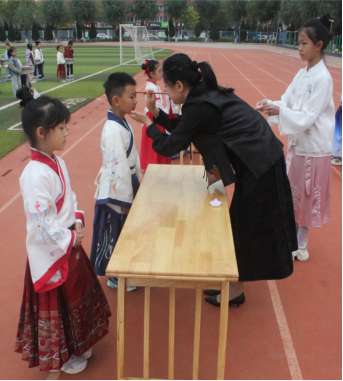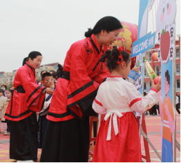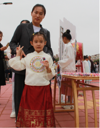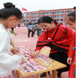 点朱砂又称“开天眼”寓意开启智慧,从此眼明心亮,发奋读书。校领导和老师们用笔蘸上朱砂,在孩子的额头正中点上红痣,痣又通“智”,智慧的智,意为开启智慧,以此寄托美好的意愿,一颗颗红痣饱含着父母、长辈、学校的美好祝愿在额上闪耀,在孩子心中勾画起一道道亮丽的风景。