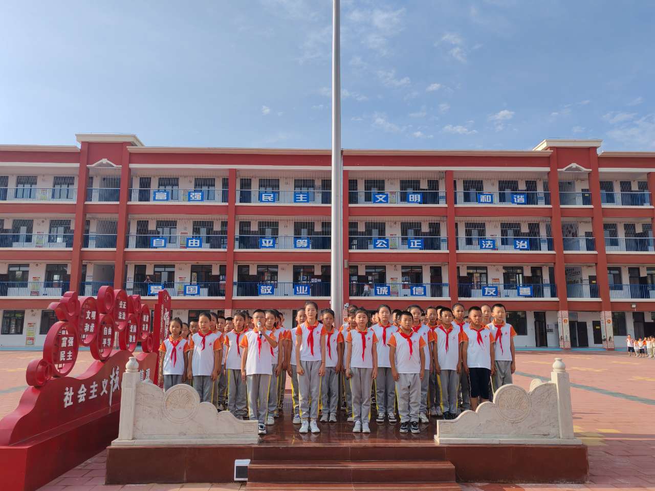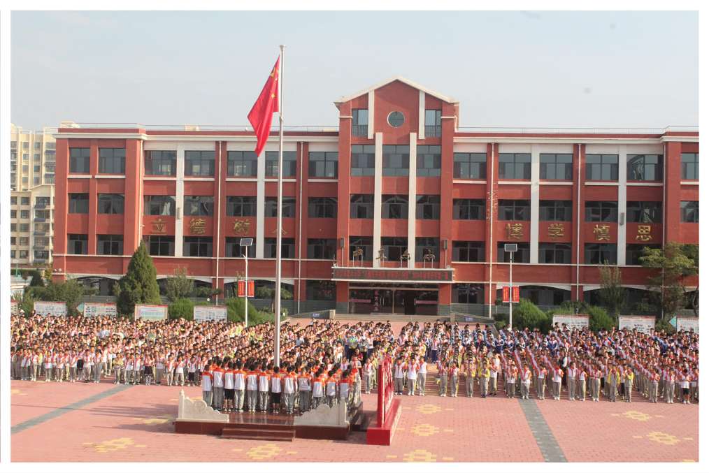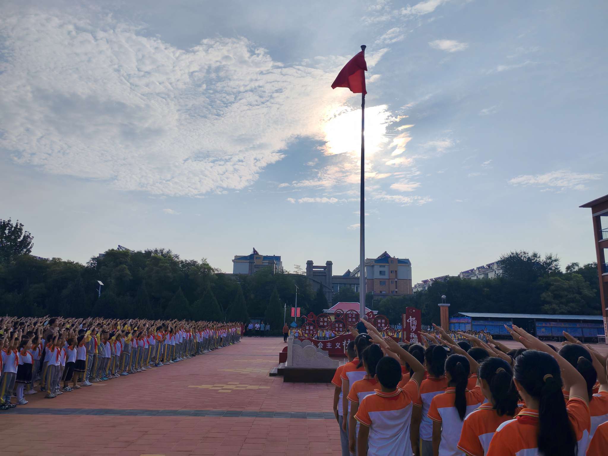 迎风旌旗,昂扬起舞,映衬朝阳,光彩熠熠。伴随着雄壮的国歌,鲜艳的五星红旗迎着朝阳缓缓升起。奏唱国歌,全体教师行注目礼,少先队员行队礼,气氛庄严,歌声回荡,冉冉升起的旗寄托了全体师生对美好未来的憧憬,共同翻开崭新的画卷。