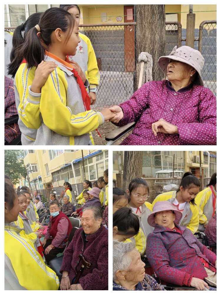 表演结束,同学们走到老人中间,与爷爷奶奶面对面交谈。有的同学与老人聊天,倾听他们的故事;有的同学给老人唱着喜欢的歌谣,给予他们精神上的慰藉;还有的同学推着老人在院子里散步。当然,老人们也不甘示弱,或唱着红歌,或给同学们讲故事。虽然有的老人身体欠佳,但是有一颗童心,和同学们欢声笑语,不亦乐乎。