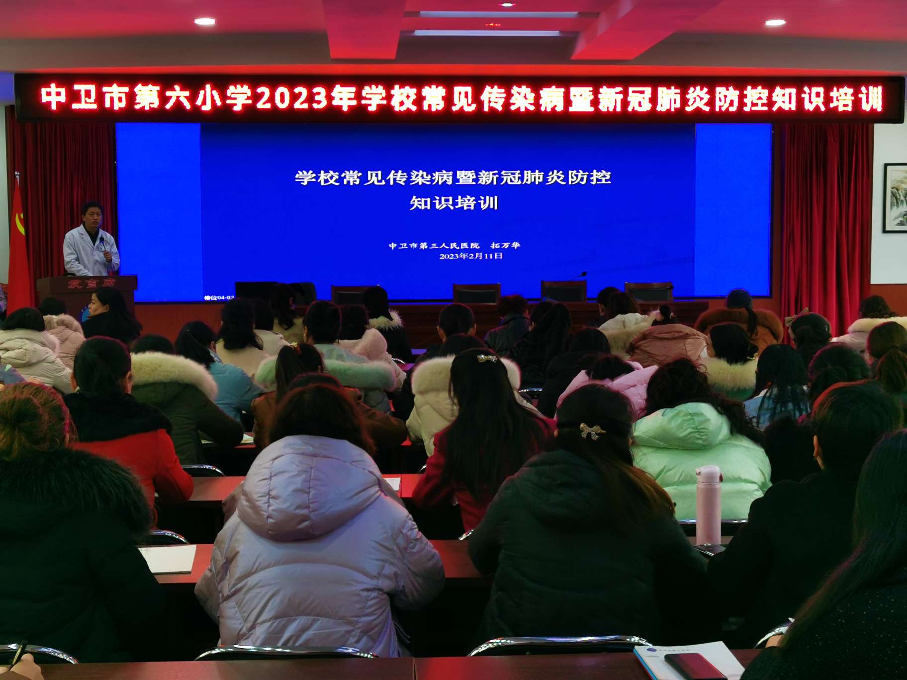 在演练前,组织全校教职工开展培训会。首先邀请了中卫市第三人民医院拓万华医师对我校全体教师进行了“学校常见传染病及新冠肺炎防控知识培训”专题培训。培训中重点讲解了师生健康管理,并就如何控制传染病、切断传染途径、保护易感者做了详细的解释和说明。