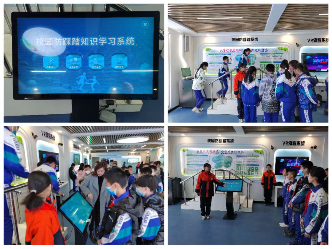 在互动体验环节,先由解说员为同学们介绍校园防踩踏体验学习系统的四大板块:知识学习、互动答题、案例警示、模拟演示。解说员一边讲解,一边示范操作。点击知识学习按钮,进入校园防踩踏知识学习,中途可返回首页;点击开始答题按钮,进入校园防踩踏知识答题,共计十题,答对加十分,答题完成进行总分统计;点击案例警示按钮,进入校园防踩踏案例学习,最后教师带领同学们进行模拟演示,体会校园防踩踏的重要性。