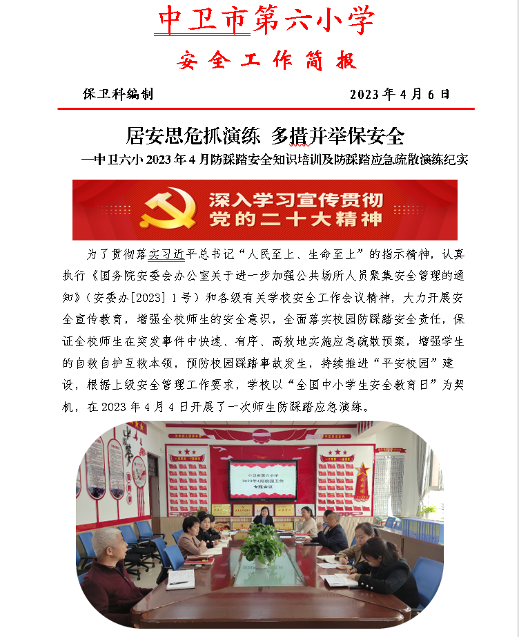 发布时间:2023-04-10 09:55 分类:安全工作简报 发布单位:中卫市第六小学 点击量:2527 【公开】