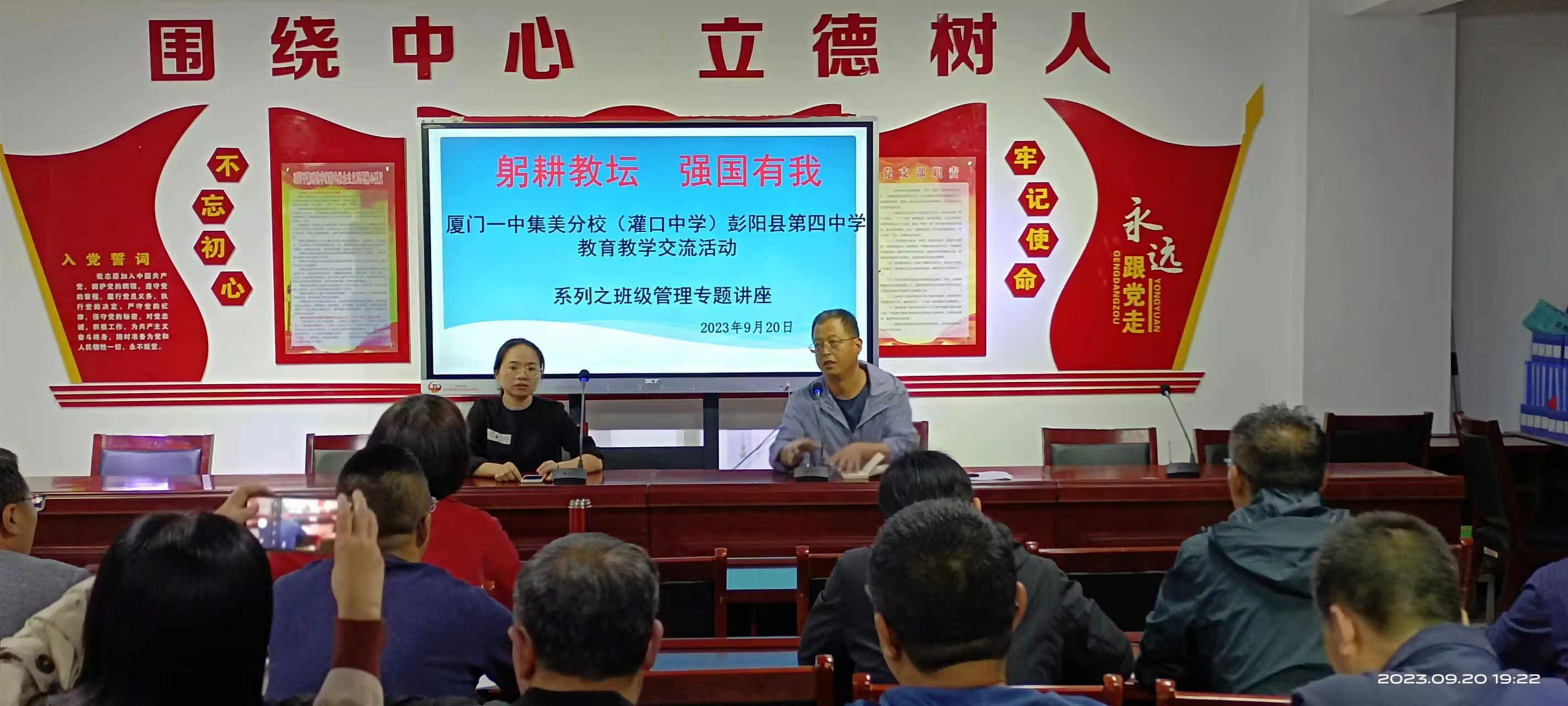 9月20日晚自习时间,灌口中学的初二年级段长叶伟婷老师在办公楼三楼党员活动室为我校班主任作了主题为“守正创新 静待花开”的班主任经验交流讲座。讲座上,叶老师从自己实实在在的班级管理经验谈起,对学生的纪律约束、与学生的沟通交流、对学生活动设计等方面做了全面细致讲解,分享了班主任对学生管理的成功经验。我校全体班主任参加了专题讲座活动。