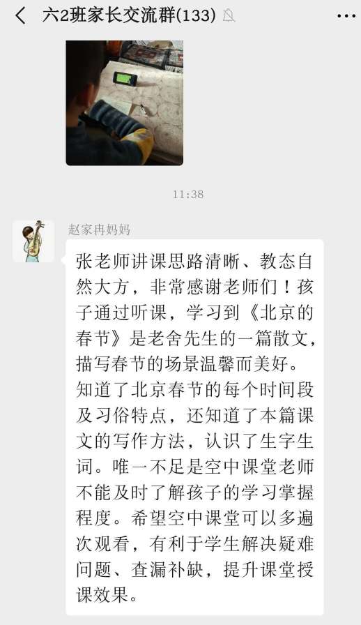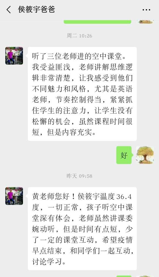 侯晓宇同学说:“听了三位老师的空中课堂直播,我受益匪浅。老师讲解思维逻辑非常清楚,让我感受到他们不同魅力和风格,尤其是英语老师,节奏控制得当,紧紧抓住学生的注意力,让学生没有松懈的机会,虽然课程时间很短,但是内容充实。”