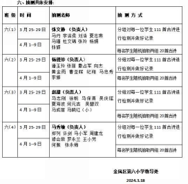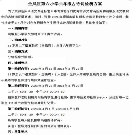 诵经典之章,品诗词之韵。古典诗词是我国文化宝库中的璀璨明珠,是中华民族文学表达的瑰丽宝藏。为弘扬诗词文化,引领学生感受诗词之美,激发学生诵读经典古诗词的兴趣,迎接2024年银川市教科所和金凤区教研室古诗文抽测活动,金凤区第六小学于2024年3月25日至4月3日对所有六年级学生进行古诗词背诵检测活动。
