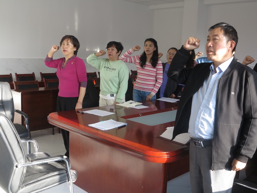 活动第一项,重温入党誓词。全体党员同志面向党旗,举起右拳,在桂金梅同志的带领下庄严宣誓。
