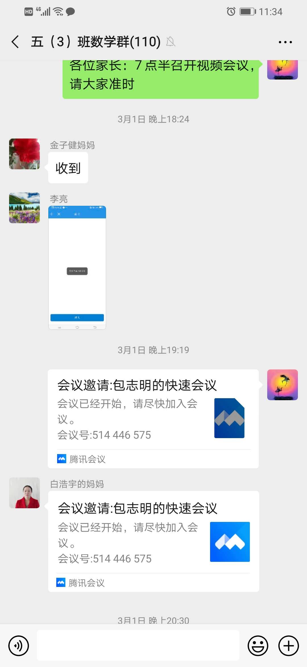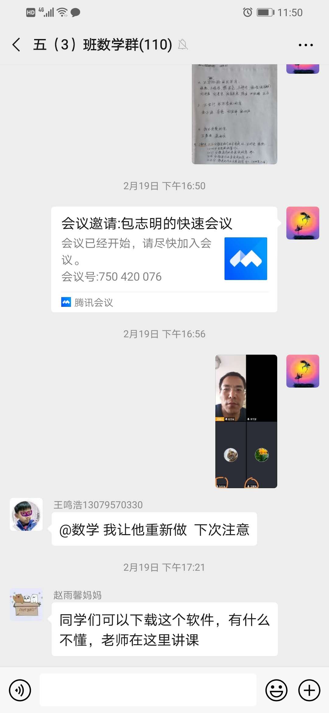 说干就干,我在手机和电脑上都下载了“腾讯会议”小程序,然后邀请了几位家长参与进来体验,效果很好!此时,我仿佛看到了几十双求知的小眼睛透过屏幕在家就可以走进包老师的数学课堂,听到包老师绘声绘色的讲解数学知识,隔着屏幕孩子们与我热烈的讨论着数学书中的每一个知识点,空中课堂的新鲜感和孩子的好奇心使他们比平时更加认真、努力。这是一幅多么神奇、美好的教学画面呀!