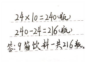 提问:怎样列式? 预设:求9箱水有多少瓶?就是求9个24是多少,列式是24乘9。 2、探究算法。 (1)估算 提问:你能估算出积的取值范围吗? 预设:10箱是240瓶,9箱一定比240瓶少;24比20大,20×9=180,24比30小,30×9=270,24×9的得数在180和270之间。 (2)探究算法 提问:准确的结果是多少呢? 把你的想法写出来。 预设:呈现学生作品