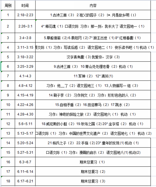 本册教材共有23篇课文和一个综合性学习。教材仍以专题形式组织内容:导语,课例(精读课文,略读课文,综合性学习,思考练习,阅读链接,资料袋),口语交际,习作,语文园地(交流平台,词句段运用,书写提示,初试身手,日积月累等)。
