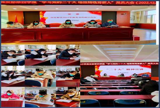 为深入学习贯彻党的二十大精神,把思想和认识统一到党的二十大精神上来,把智慧和力量凝聚到党的二十大确定的各项任务上来,12月21日,中卫市第六小学党支部通过线上线下相结合方式召开专题“学习党的二十大 培根铸魂育新人”全体党员大会。会议由党支部书记张莉娟主持。全体党员、预备党员、积极分子参加。