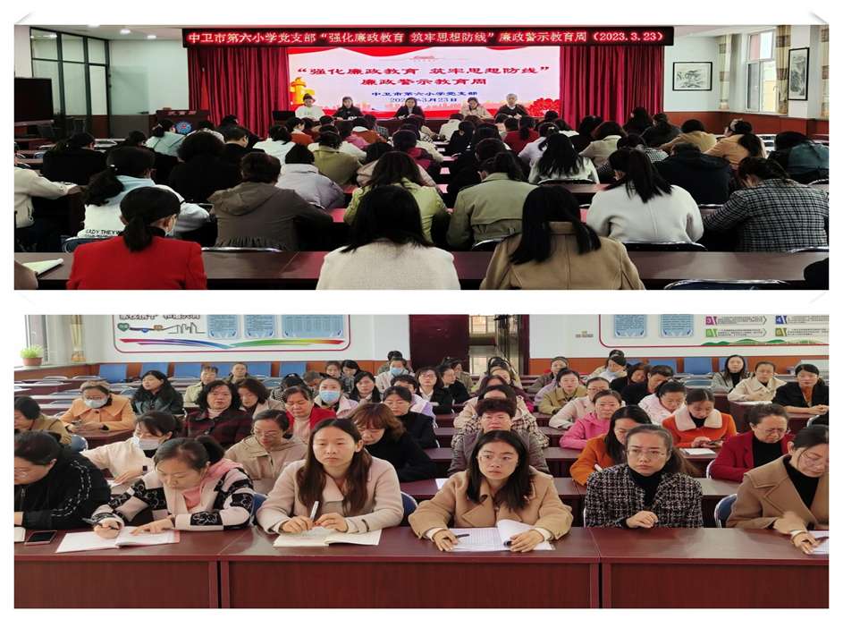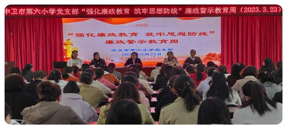 为持续推进党的自我革命,教育引导党员领导干部常怀忧党之心、为党之责、强党之志,不断锤炼“赶考”本领,为全面落实立德树人根本任务,深入践行“为党育人、为国育才”初心使命,办好人民满意的教育提供坚强保障。根据市教育工会《关于印发<2023年中卫市教育局机关和直属学校领导干部“廉政警示教育周”活动方案>的通知》(卫教工委〔2023〕16号)精神,中卫市第六小学党支部于2023年3月23日上午8时,在四楼会议室组织全体教师开展“强化廉政教育筑牢思想防线”廉政警示教育周活动,张莉娟同志主持,全体教师参加。
