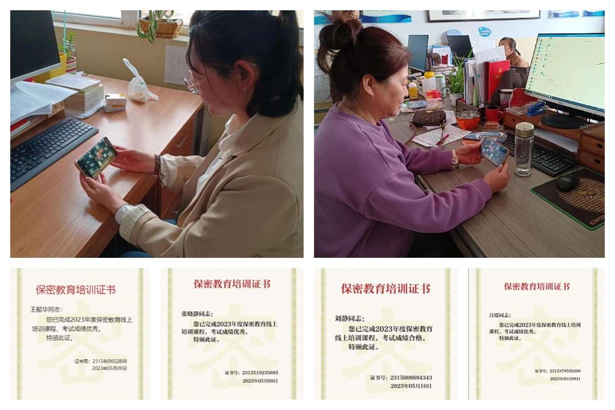 5月8日-5月12日,组织全体教师依托“保密观”APP和中国保密在线网站培训系统进行,课程包括保密优良传统、法律法规、知识常识、技术规范和警示案例5个部分,学习完成满4个学时后可参加线上考试,成绩合格者获得《保密教育培训证书》。在学习中,全体教师认真听取线上讲座,学习保密知识,并纷纷表示在今后的工作中,坚持底线思维,增强忧患意识,警惕工作和生活中的泄密隐患,切实履行保密责任和义务,共同筑牢保密防线!137名教师于5月12日全部学完了必修的课程,并且经过考试顺利拿到了保密教育培训证书,合格率100%,优秀率54%。