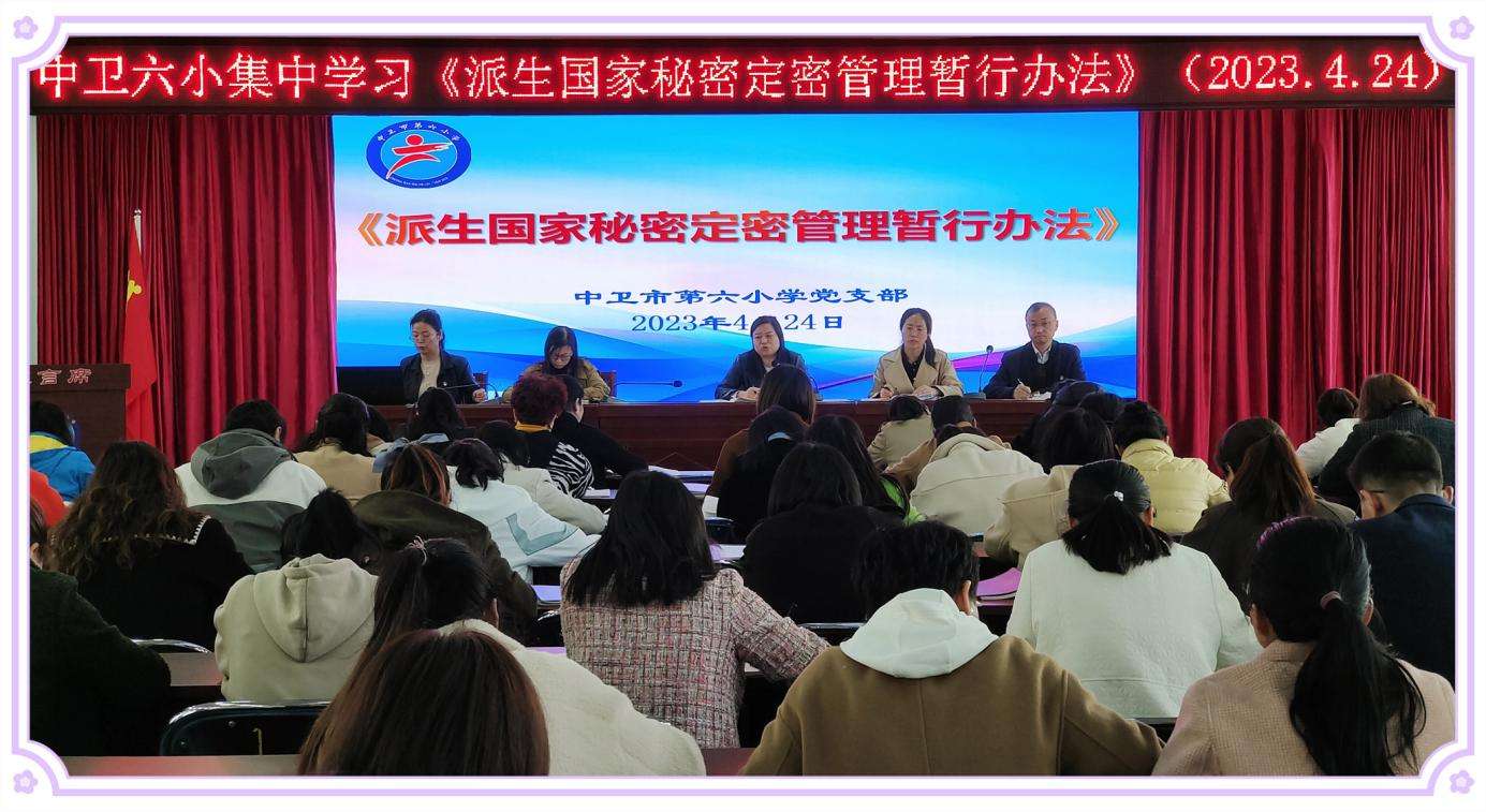 中卫市第六小学党支部利用每周例会组织全体教师学习了《保密法》《保密法实施条例》《派生国家秘密定密管理暂行规定》《信息公开保密审查制度》等保密法律法规,利用主题党日活动,组织全体教师观看国家安全教育专题片《光芒》,利用各类正反面教材,开展了保密常识教育,进一步提高了教师们保密素养。同时,号召全体教师充分认识新形势下加强保密宣传工作重要性,以高度的责任感和使命感积极投身到宣传教育活动中,切实增强保密意识,提高保密工作能力,努力形成全员参与的宣传教育氛围。