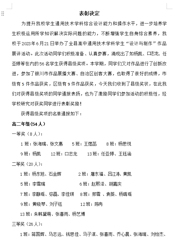全县高中通用技术学科学生“设计与制作”作品展评活动表彰