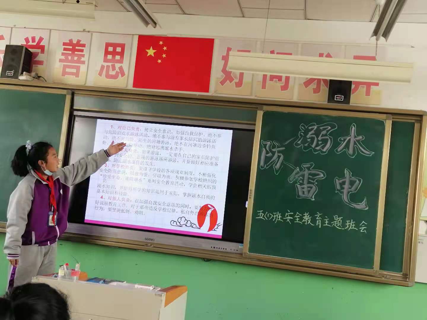 对学生开展防雷电、防溺水知识教育。我校通过预防溺水事故专题教育班会、黑板报、手抄报等宣传手段对学生进行防雷电、防溺水安全知识教育。形式丰富的教育形式使每一个学生都充分认识到在危险水域玩水、私自结伴下水的严重后果;能自觉抵制同伴下河游泳的建议,并能劝阻、制止同伴下水。
