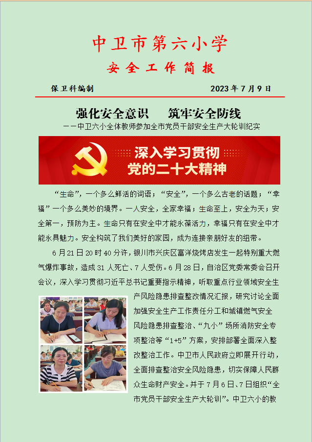 发布时间:2023-07-10 10:44 分类:安全工作简报 发布单位:中卫市第六小学 点击量:2809 【公开】