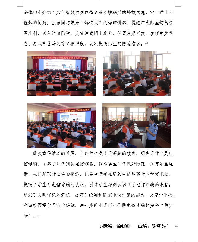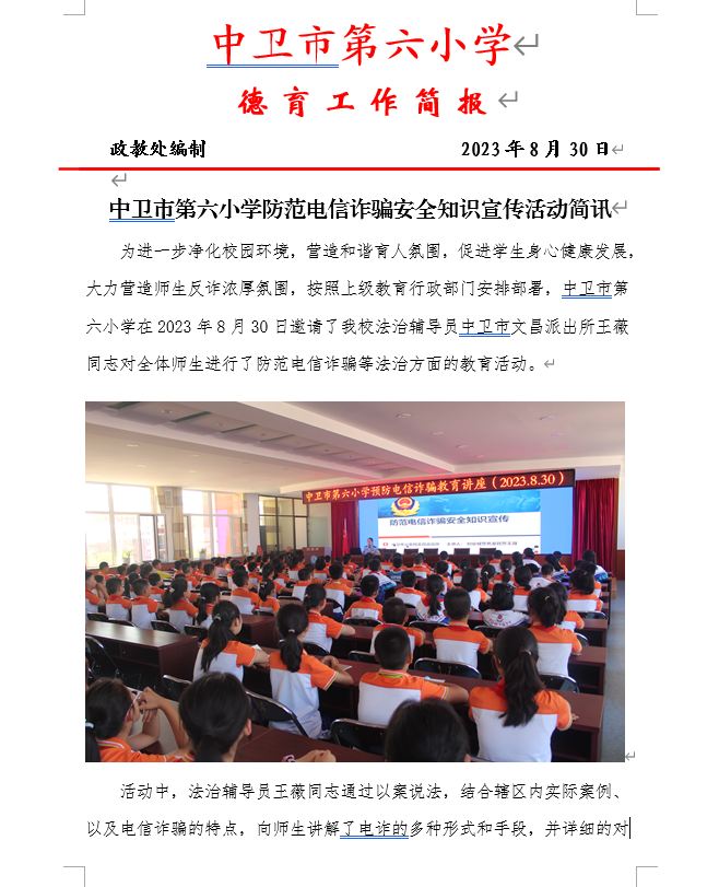 发布时间:2023-08-31 20:01 分类:安全工作简报 发布单位:中卫市第六小学 点击量:3063 【公开】